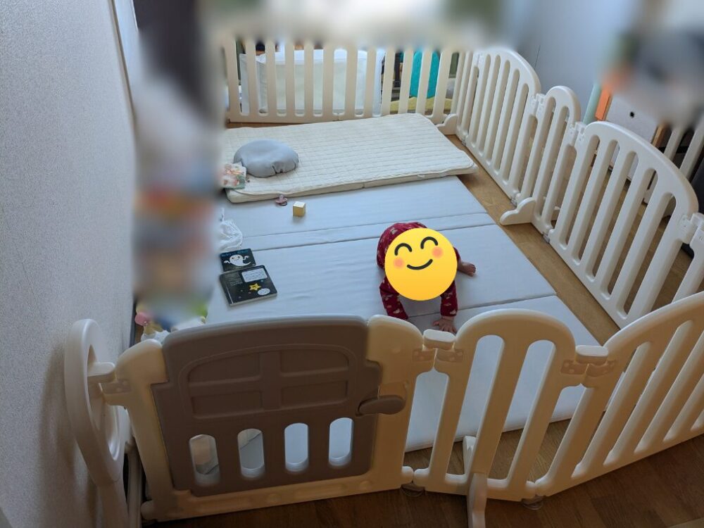 - 現在: プレイマットの周りを「ベビーサークル」で囲って、その中で自由にさせる。