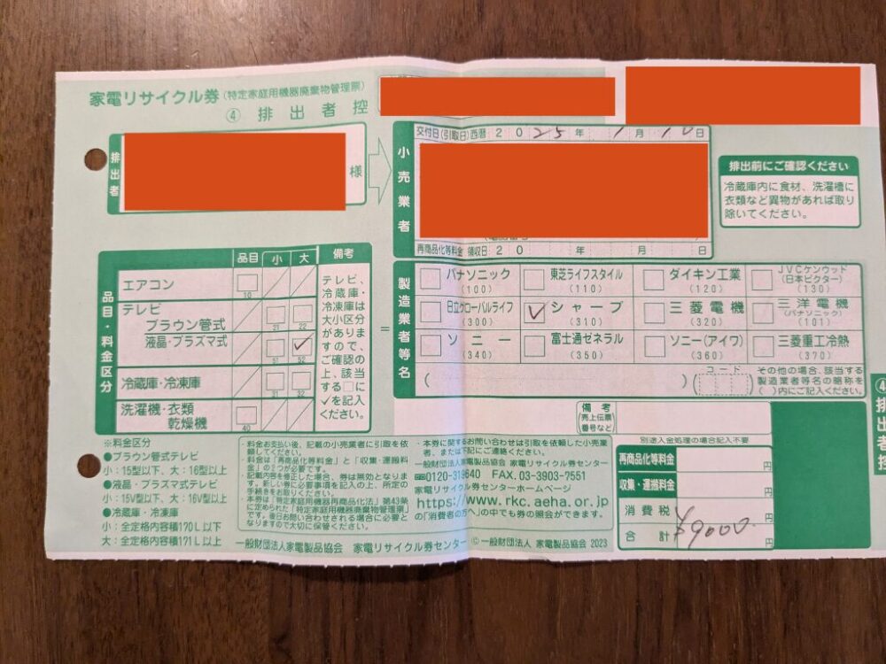 この時にもらえる「家電リサイクル券の控え」や「買取証明書」は、必ず捨てずに保管してください!NHKから「本当に処分した証明を出して」と言われた時に必要になります。